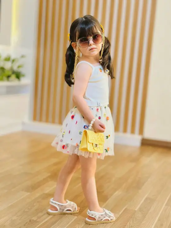 دامن: دامن تورکریستال تمام گلدوزیشده، جلوهای خیرهکننده و مجلسی دارد. طرحهای گلدوزی ظریف و هنرمندانه روی تور کریستال، درخشش و جذابیت خاصی به این دامن بخشیده و آن را به نقطه کانونی استایل کودک شما تبدیل میکند. این دامن سبک و خنک، با حرکت نرم و لطیف خود، حس راحتی و آزادی را در مهمانیها و جشنها فراهم میکند.